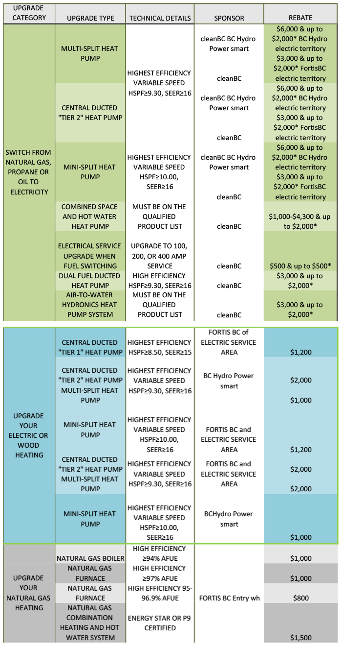 If you wish to switch to a heat pump, here are available rebates you can benefit from in British Columbia. Keep in mind that the following rebates can be combined for the maximum savings possible: