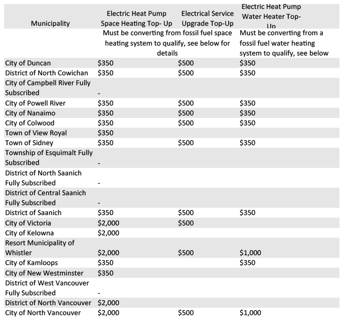 The above-mentioned $6000 heat pump rebate applies to whoever resides in BC while the municipal top-ups are only available to some municipalities as shown in the chart below.